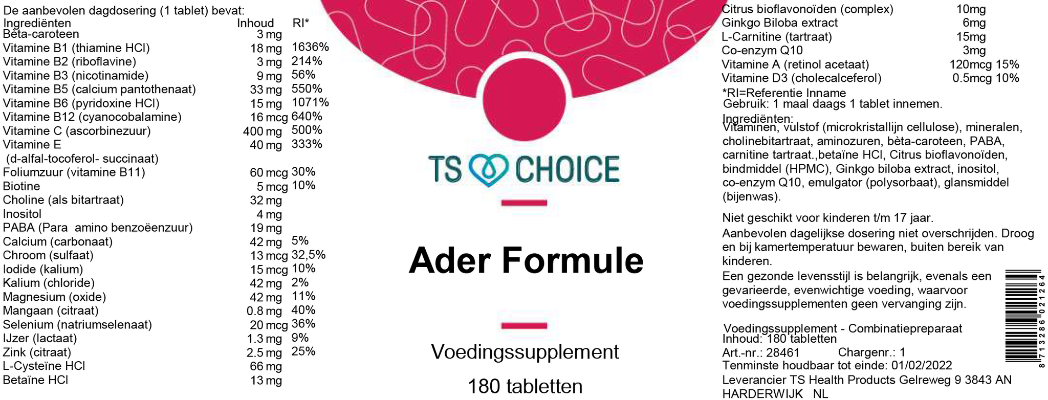 Naast deze vitaminen en mineralen bevat TS Choice Ader Formule ook Ginkgo biloba-extract, citrus bioflavonoïden, betaïne HCl, L-carnitine en co-enzym Q10 – natuurlijke verbindingen die perfect passen binnen een actieve leefstijl. De combinatie met choline, inositol en PABA maakt het geheel extra uitgebalanceerd.